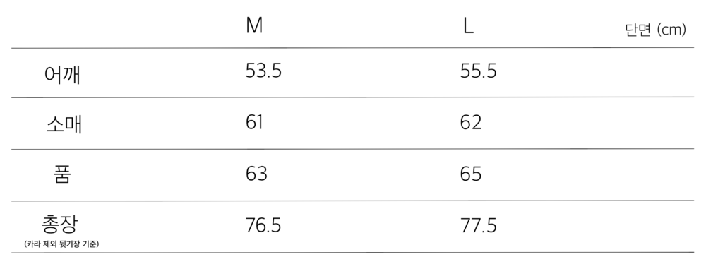 품이 넓고 총장이 길지 않은 오버사이즈 형태입니다.